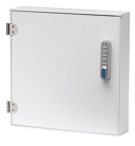 Master, sub-master and user code options offer flexibility in level of security. Keyless touch pad uses 4-digit code you program yourself. Electronic lock uses 1 AAA battery (included) and has a battery failure override. White ABS plastic cabinet impedes viewing of contents and is easily cleaned.